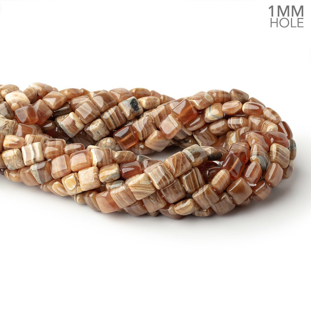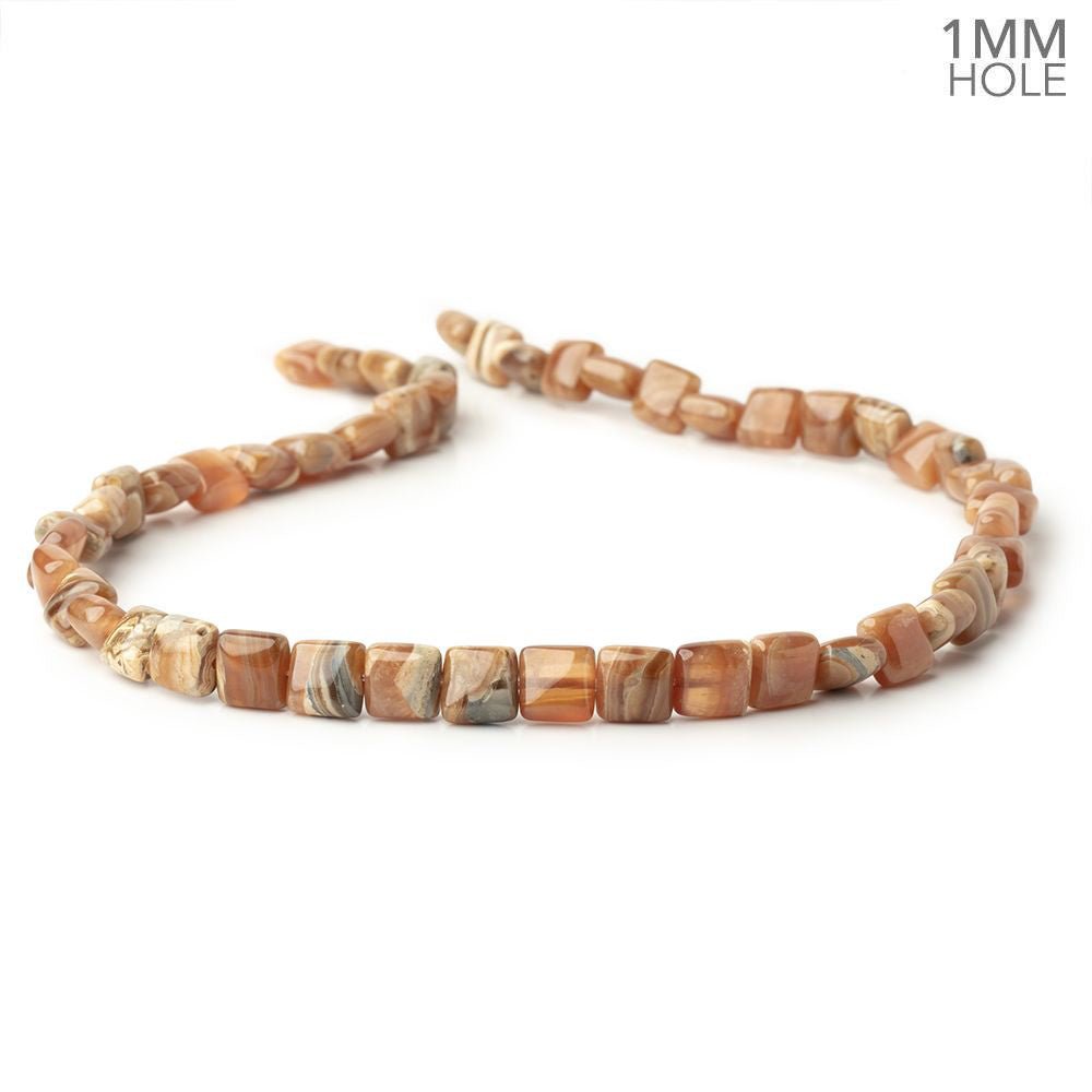 Rhodochrosite plain square beads measure approximately 8x8mm in size with 1mm drill holes, have a vitreous luster, show good polish, and are well matched for tone on the strand. These gems exhibit internal characteristics in the semi opaque bodies and have taupe and burnt orange hues with the lovely bacon strip effect common to Rhodochrosite.