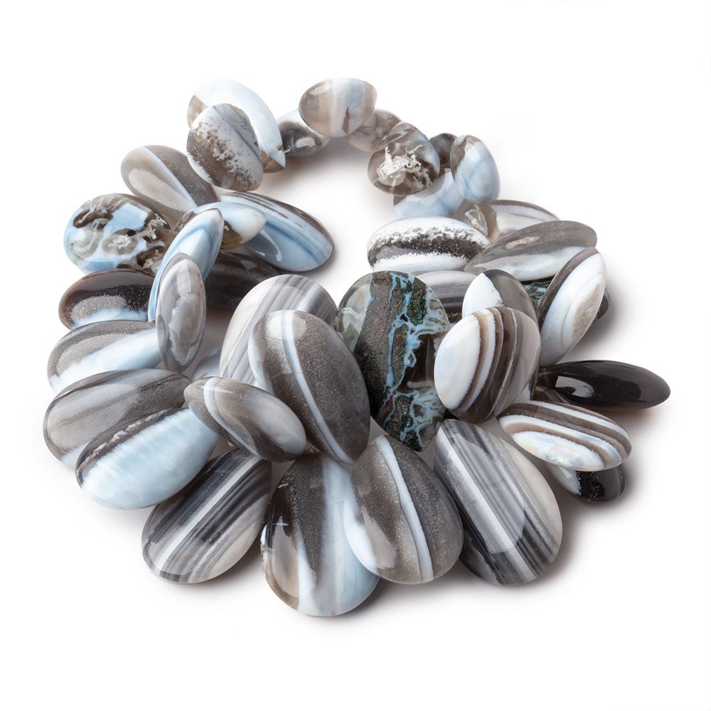 Banded Owyhee Blue Opal and Grey Agate plain pear beads measuring 12x8mm to 25x16mm have a waxy luster with unmatched beauty on this strand with denim blue, cream, sea green, and gray hues. These Pears are smoothly polished and symmetrical exhibiting a natural veining throughout the strand. A real show stopper due to its AA grade and overall appeal.