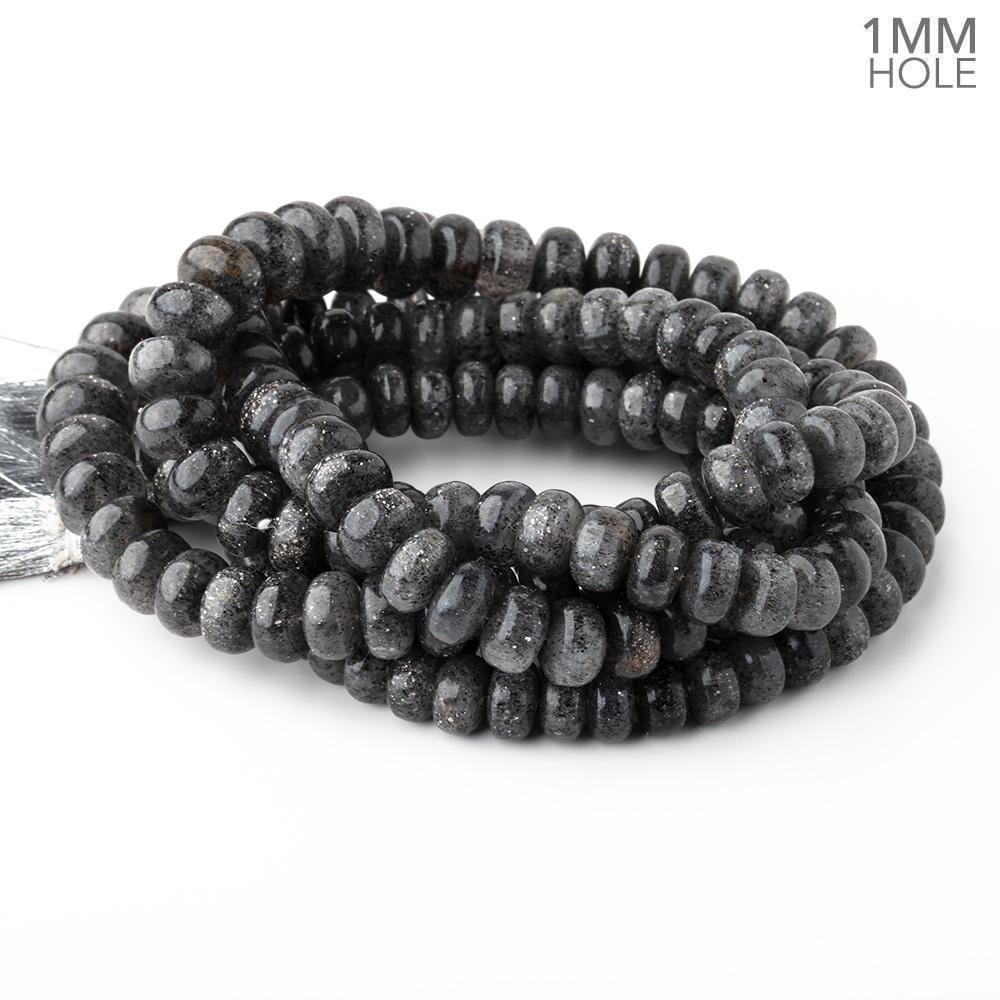 7mm to 11mm Celestial Quartz plain rondelle beads have a charcoal grey/brown hued body with sparkling metallic platelets, the beads have a vitreous luster, gems present with a semi-transparent quality, and the make is excellent with smooth polish on their symmetrical bodies. These quartz rondelles exhibit shimmering silver-hued platelets that resemble the night sky, hence their name Celestial Quartz (Elestial Quartz). This new gemstone find is mined from Madagascar. These rondelles also have a 1mm inside diameter drill hole.