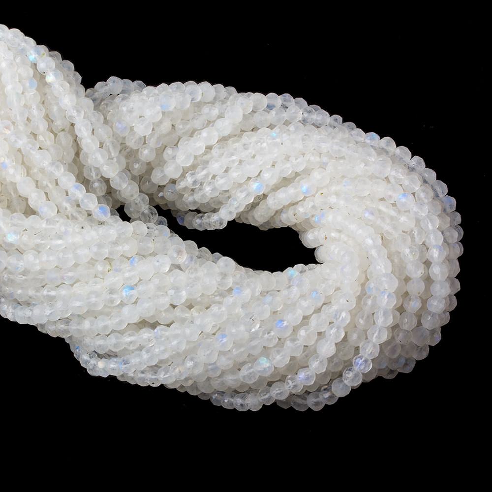 Rainbow Moonstone Faceted Rounds measure approximately 3mm to 4mm in diameter, have a vitreous luster, show a neon blue-green adularescence in the colorless transparent body, shapes are symmetrical and full bodied, gemstones are well matched for tone and slight milky clarity on strand, facets and polish are of good quality, and stones present with slight internal characteristics within these lovely and petite round rainbow moonstone beads.