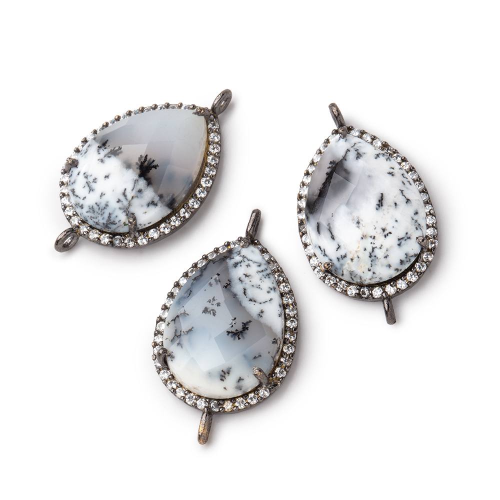 26x16mm with the two rings, this Black Gold Plated Bezeled Dendritic Opal Faceted Pear Connector with White CZs is sold as 1 focal piece.