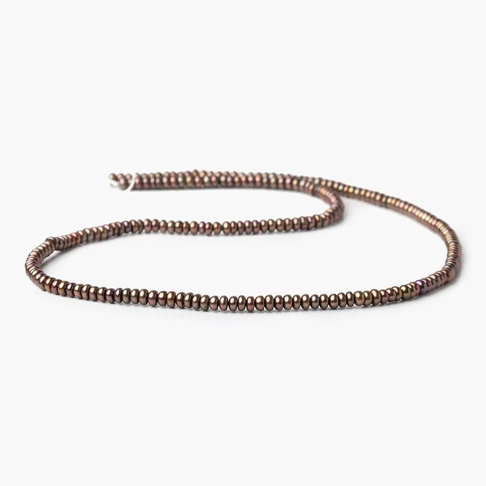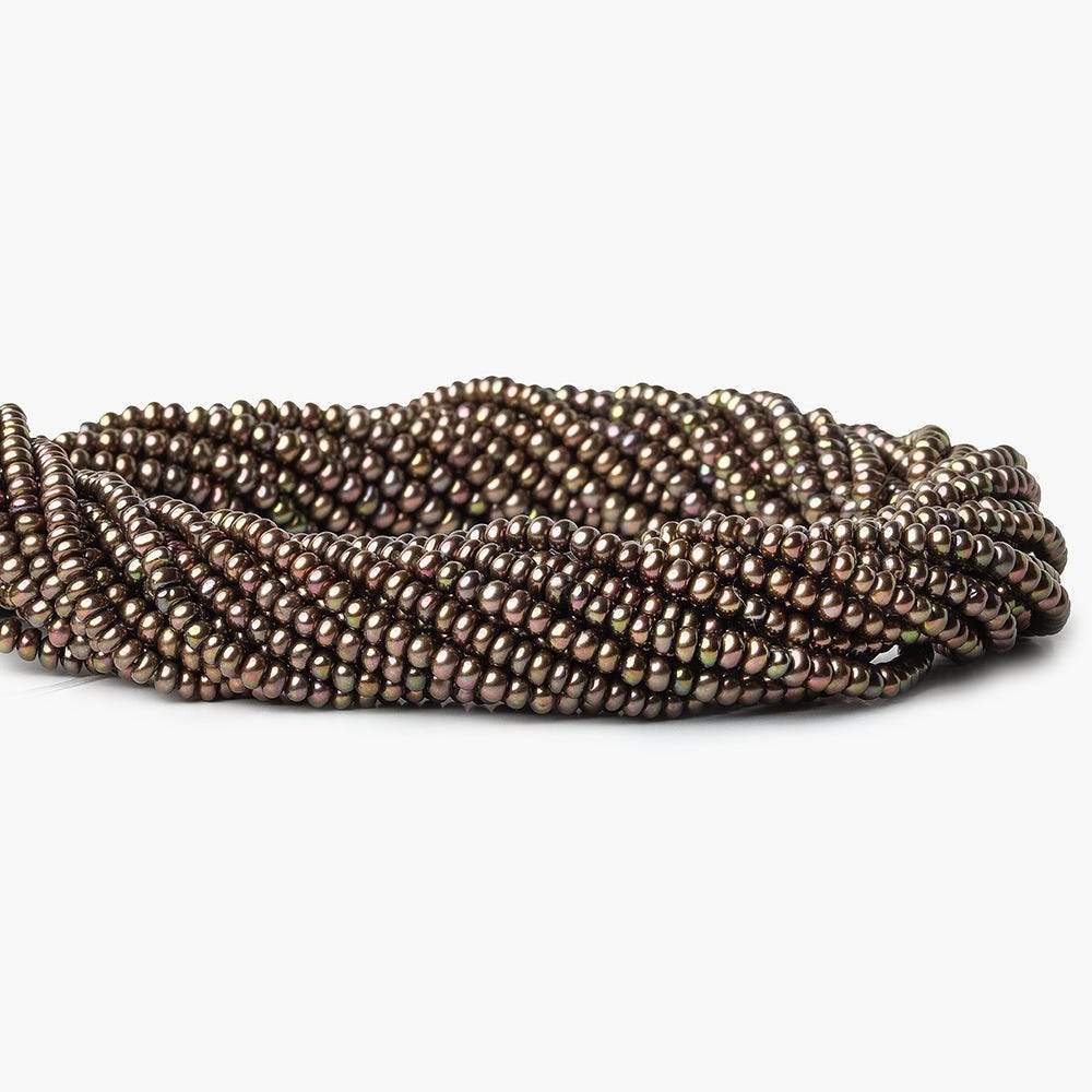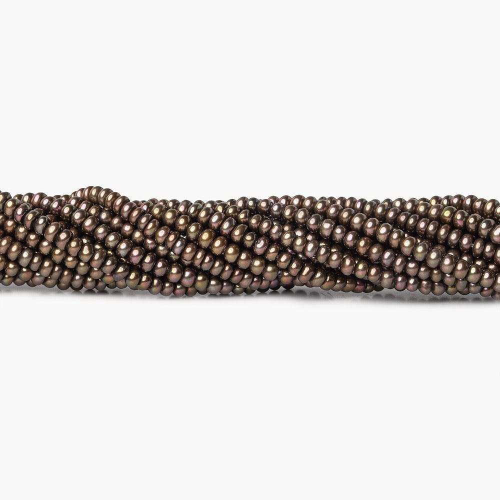Eggplant Center Drill Button Freshwater Pearls measure approximately 3mm in diameter, have excellent luster, excellent symmetrical shapes, are well matched on strand for color and tone, have consistent very high luster throughout the strand, and are a small size button pearl strand grading as A quality in a slightly greenish Purple hue resembling the body of an Eggplant.