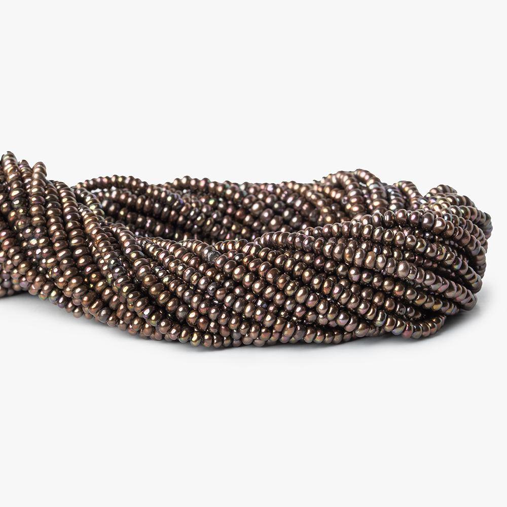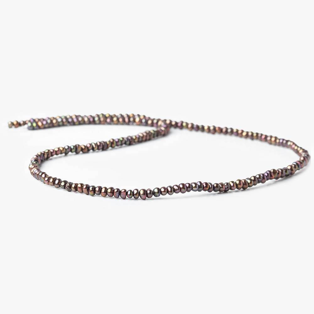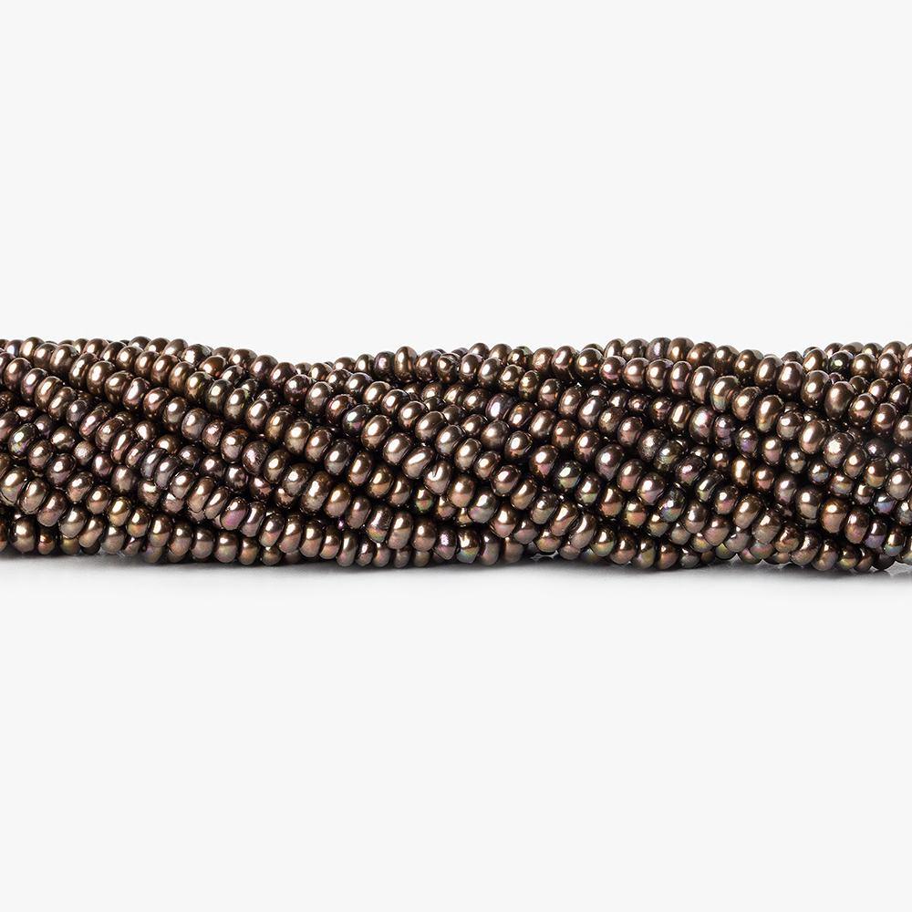 Iridescent Green Center Drill Button Freshwater Pearls measure approximately 3x2mm in diameter, have excellent luster, excellent symmetrical shapes, are well matched on strand for color and tone, have consistent very high luster throughout the strand, and are a small size button pearl strand grading as A quality in a copper Green hue.