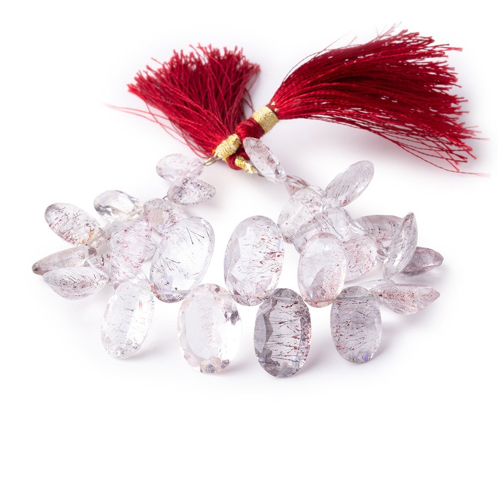Lepidocrocite and Moss Amethyst Oval Briolettes with Pavilion Faceting are highly brilliant with vitreous luster, show excellent cut and polish in a transparent gemstone, gems show minor to moderate internal features of mossy internal characteristics, and the symmetrical Moss Amethyst beads exhibit a very light pinkish purple to medium strongly purple hue with a great make. AAA Quality