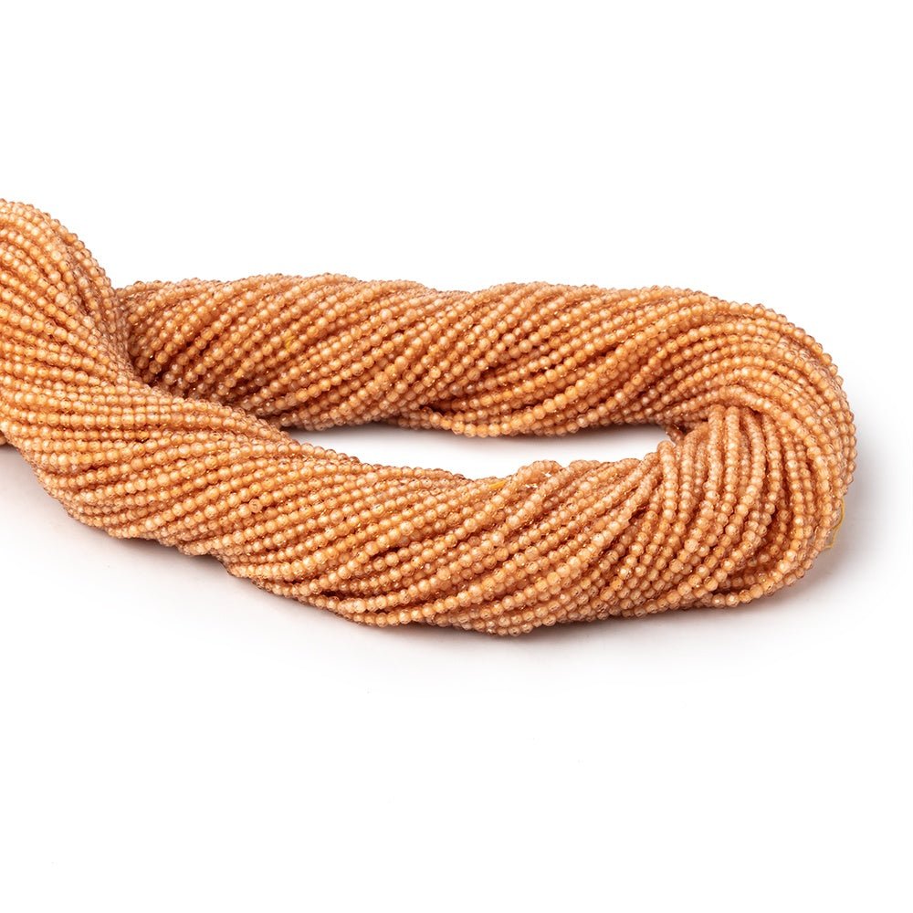1.5mm Mandarin Garnet Micro Faceted Round Beads have a vitreous luster showing a consistent strong citrus orange hue on the strand of well crafted micro faceted round beads. AA Quality