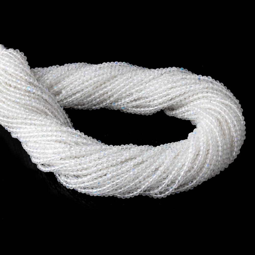 2.3mm Rainbow Moonstone micro faceted rounds have a superbly brilliant body showing a vitreous luster on expertly crafted beads showing excellent symmetry and perfect micro fine facets with blue flash. AAA Grade