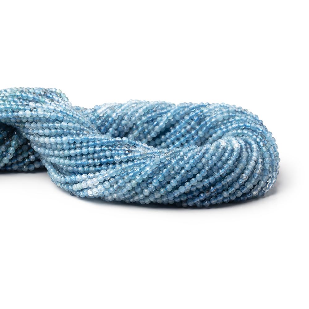 2.4mm Shaded Aquamarine micro faceted round beads exhibit a vitreous luster, show excellent make on the brilliant transparent bodies with slight internal characteristics common to the Beryl family, and the colors are shades of sky blue hues.