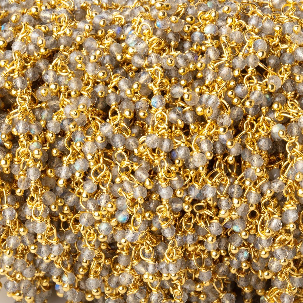 2mm Labradorite micro faceted rounds on Vermeil Dangling Chain are sold by the foot. These calibrated, micro faceted rounds are sparkling, perfectly symmetrical beads with consistent quality and color whether buying by the foot or the spool.