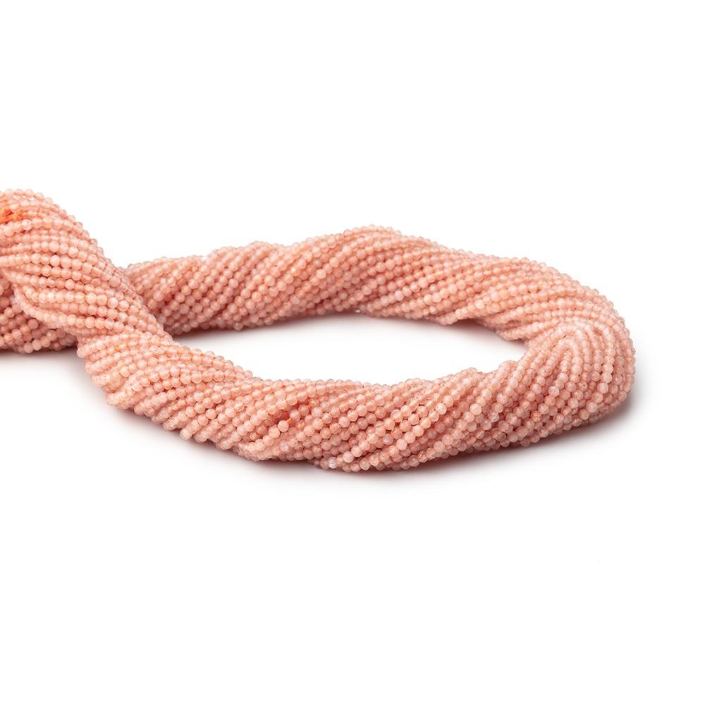 2mm Sunstone microfaceted round beads showing great brilliance, a symmetrical round shape, a well matched quality, and a well crafted group of micro-fine faceted beads.