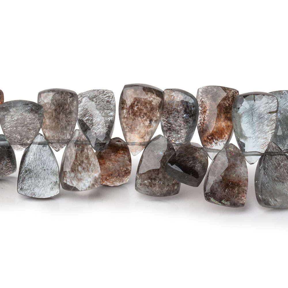Copper Moss Aquamarine Top Drilled Faceted Points measure approximately 9x7mm to 12x7mm in size, gems have a vitreous luster, exhibit excellent cut and polish, beads have a symmetrical point shaped body showing internal characteristics including Copper shiller, these transparent Moss Aquamarine beads have unique mossy features within a pale aqua blue to dark plum for a truly unique color palette of Moss Aquamarine gems with brilliant color. AAA Quality