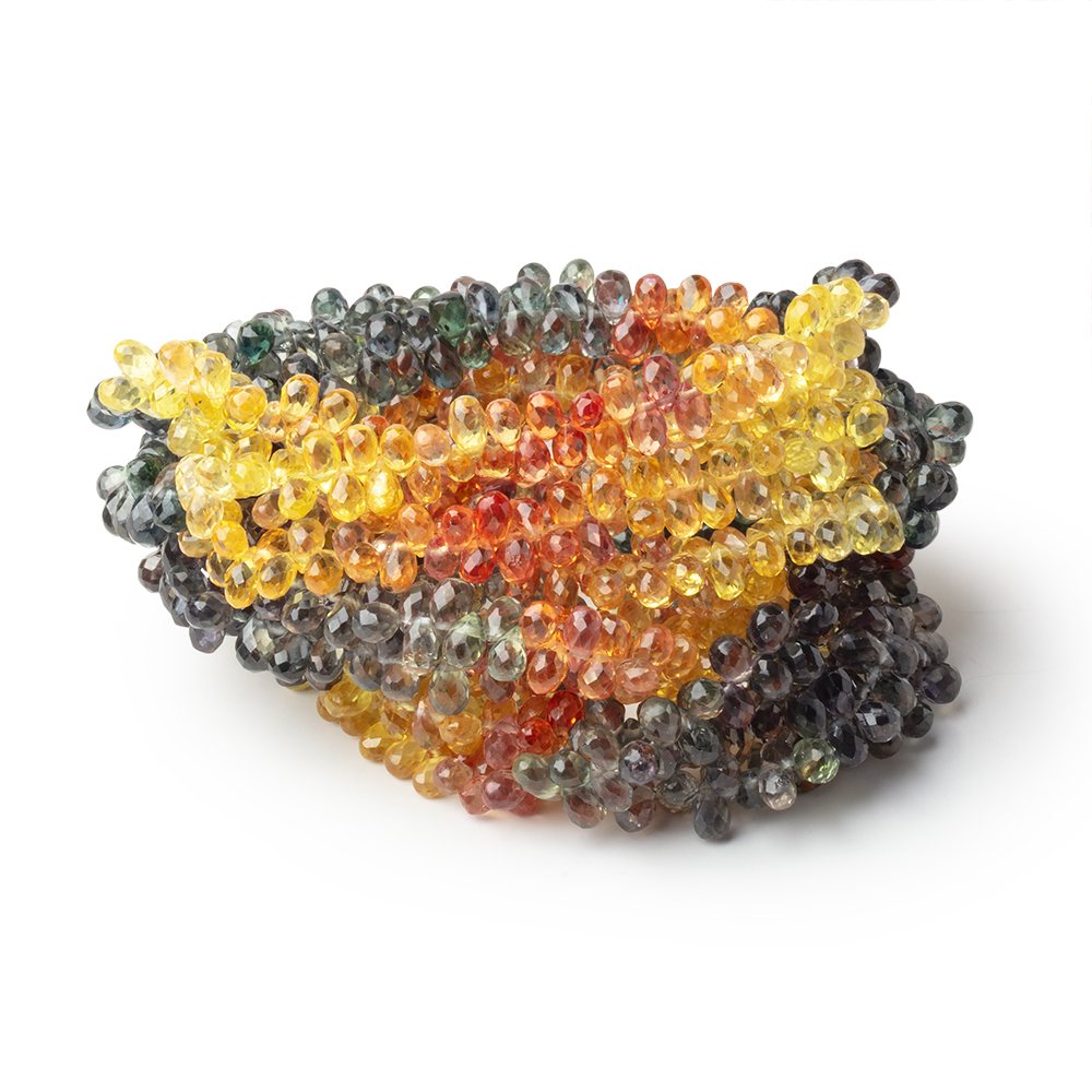 Multi Color Fancy Sapphire Tear Drop Briolettes measure approximately 4x3mm to 5x3mm in size, have a vitreous luster, show excellent micro-faceting and polish, exhibit a highly brilliant appearance, and present light to deeply saturated colors of blue, green, salmon, yellow, plum, orange, and colorless. These Fancy Sapphire Tear Drop briolettes are AA grade for color, make and quality.