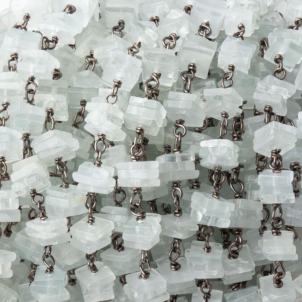 5mm to 5.5mm Aquamarine Plain Square Heshi Trio Beads on Black Gold over .925 Sterling Silver Chain is sold by the foot with approximately 102 beads per 12 inches and is hand wrapped.