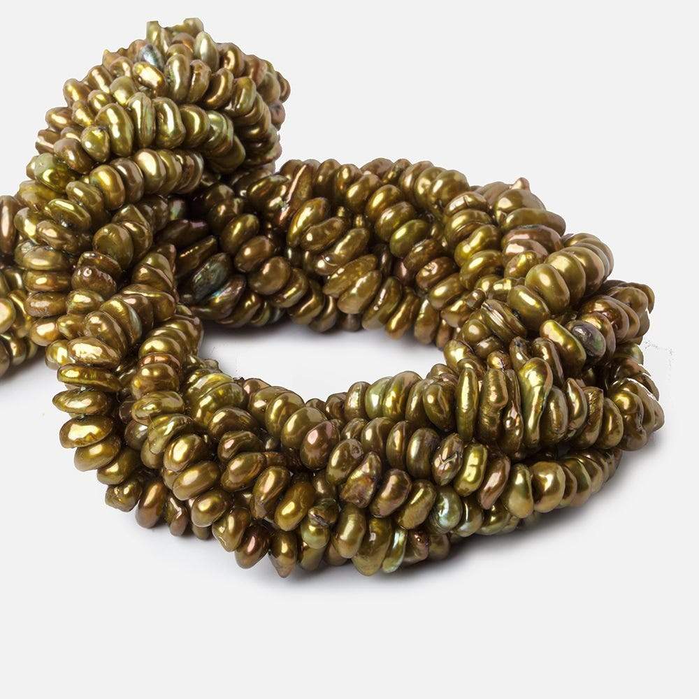 Pea Green Center Drilled Keshi Freshwater Pearls have excellent luster, good asymmetrical shapes, are well matched on strand for color and tone, have consistent nacre quality throughout the strand, and are an average size for a center drilled Keshi pearl.