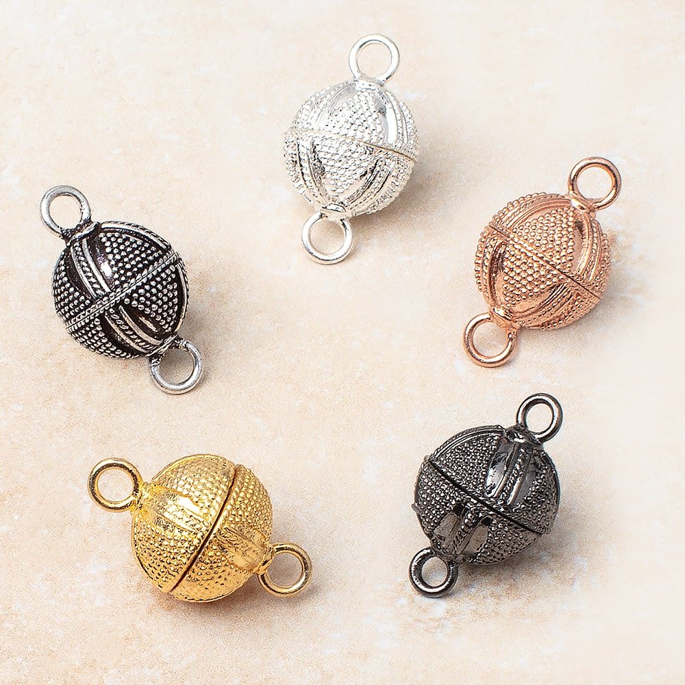 15x15mm Plated Magnetic Clasps with a Pave Triangular design are sold as one finding and have two 6mm rings at each end with approximately 4mm inside diameter holes. The overall length of this clasp is approximately 26.5mm. The 22kt Gold Plated Clasp measures approximately 15.5x13.5mm and has an overall length of 25.5mm. This Magnetic Clasp is available in 22kt Gold Plated, Silver Plated, Antiqued Silver Plated, Rose Gold Plated, and Black Gold Plated.