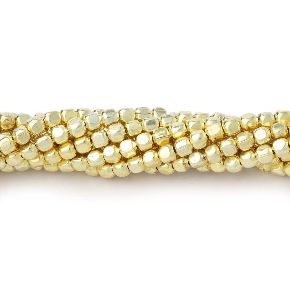 2.5mm Plain Cube Beads with rounded corners have a 1.5mm drill hole and are plated over Copper with a polished shiny finish. These 8 inch strands of beads are available in Silver, 14kt Gold, Black Gold, and Copper.
