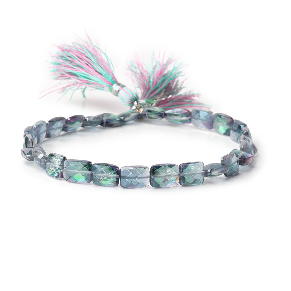 Aurora Borealis or Mystic White Topaz faceted rectangle beads measure approximately 8x6.5mm to 9x7mm in size and have a symmetrical shape with a metallic coating providing a oil in water iridescent effect on this extremely brilliant gem body. The beads are transparent with metallic purple, blue, and mint hues, and the gems are a highly refractive with excellent make, great heft, and rich color.