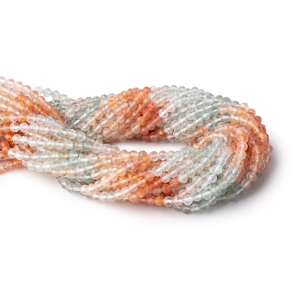 These exquisite 4mm Madagascar Sunstone beads feature precision micro-faceting that catches light beautifully, creating brilliant sparkle and depth. Each bead showcases a perfectly symmetrical round shape with translucent clarity and a captivating blend of orange, green, and colorless tones enhanced by a subtle metallic shimmer. The shaded appearance adds natural character and visual interest to any design. This strand contains approximately 80 beads, offering ample material for jewelry projects, beadwork, or mixed-media creations.