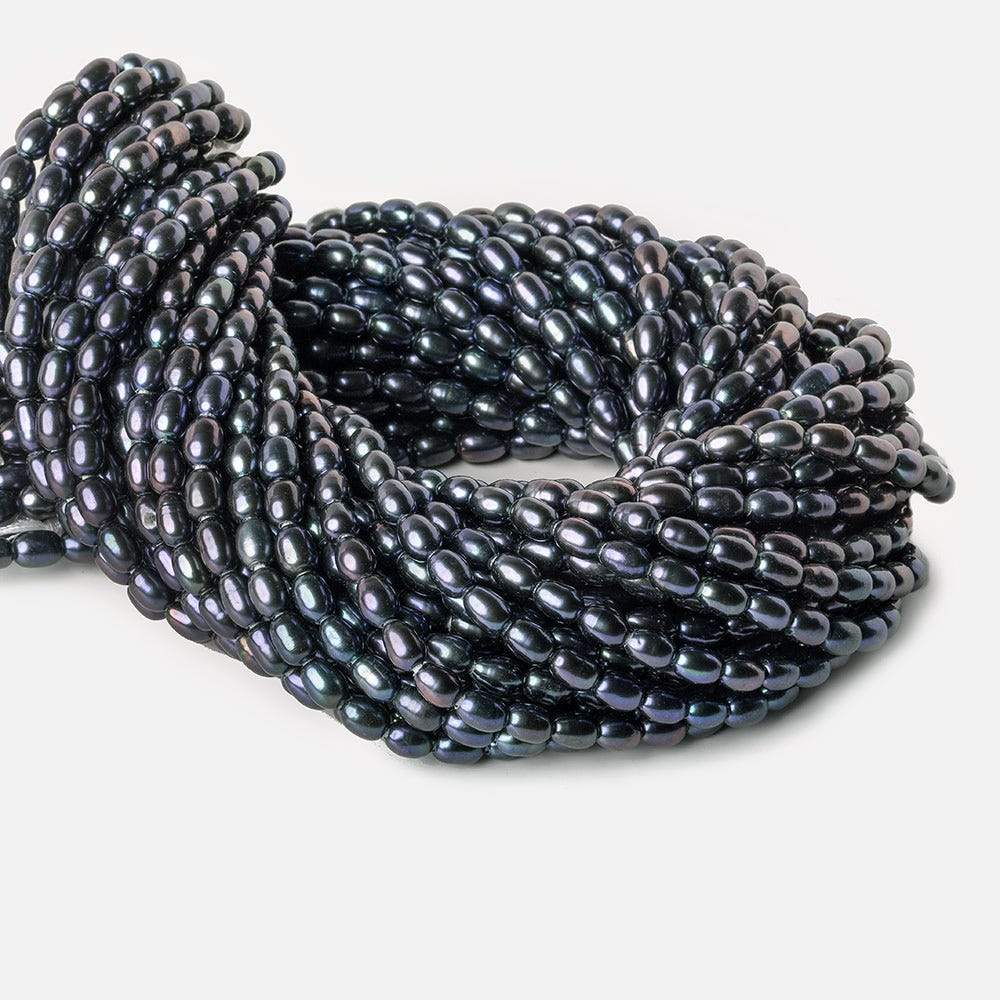 Large Hole Straight Drilled Oval Freshwater Pearls have excellent high luster, pearls have excellent nacre, are well matched for quality on strand, are straight drilled with a 1.5mm hole, and are an excellent value for an average size & well made freshwater pearl oval shape. The pearl has a deep Indigo Blue base with a strong iridescent overtone. Large Hole pearls have a 1.5mm inside diameter. The drill holes are produced with a 5 step drill process to insure a cleanly drilled hole without abrasion to the nacre and the drill hole is a consistent diameter through the pearl.