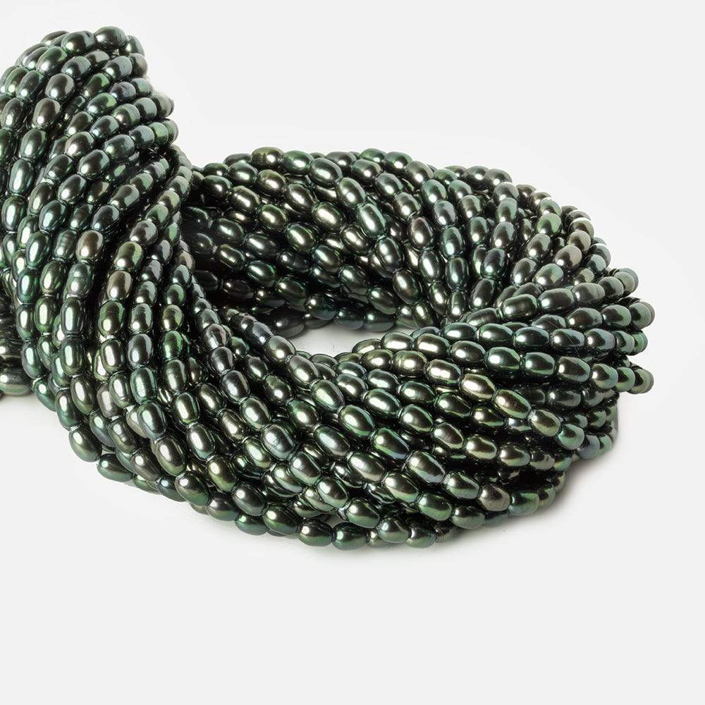 Large Hole Straight Drilled Oval Freshwater Pearls have excellent high luster, pearls have excellent nacre, are well matched for quality on strand, are straight drilled with a 1.5mm hole, and are an excellent value for an average size & well made freshwater pearl oval shape. The pearl has a deep green base with a strong iridescent peacock overtone. Large Hole pearls have a 1.5mm inside diameter. The drill holes are produced with a 5 step drill process to insure a cleanly drilled hole without abrasion to the nacre and the drill hole is a consistent diameter through the pearl.