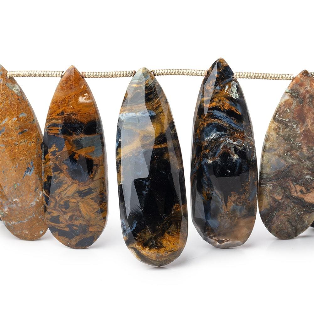 Pietersite Elongated Faceted Pears measure approximately 31x12mm to 36x12 in size, have a pearly luster showing chiromancy, the gems are a swirl pattern mix of hues such as Black, Brown, Tan, Grey, Golden, Cream, Blue Grey, and Mink Brown with schiller, the gems have excellent symmetry with excellent faceting, polish exhibits pitting or nicks due to gemstone's composite gem mix, these Pietersite beads show an opaque quality, and this rare gem is an excellent example of the South African sourced stone.