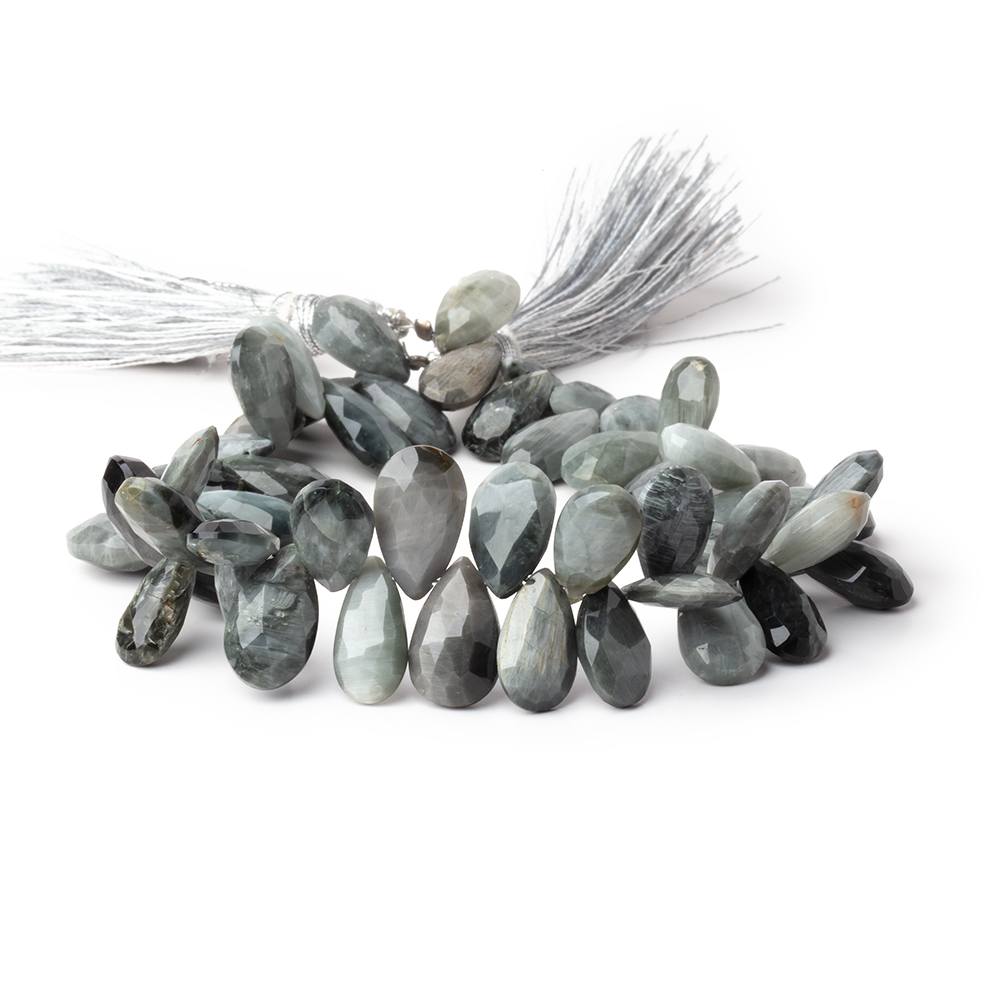 Black Tiger's Eye Faceted Pear Briolettes measure approximately 13x7mm up to 15x9mm in size, have a glassy luster, good faceting and polish, bead bodies are a light to medium grayish black hue with light grey tiger eye features throughout, each bead has its own color assortment, the tiger eye structure is not pronounced but more muted, and the beads have a semi-opaque to opaque quality.