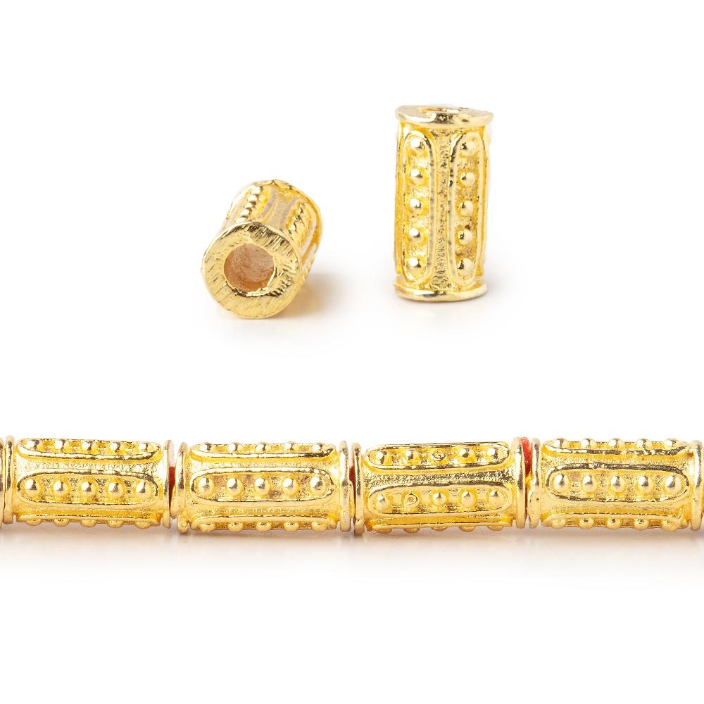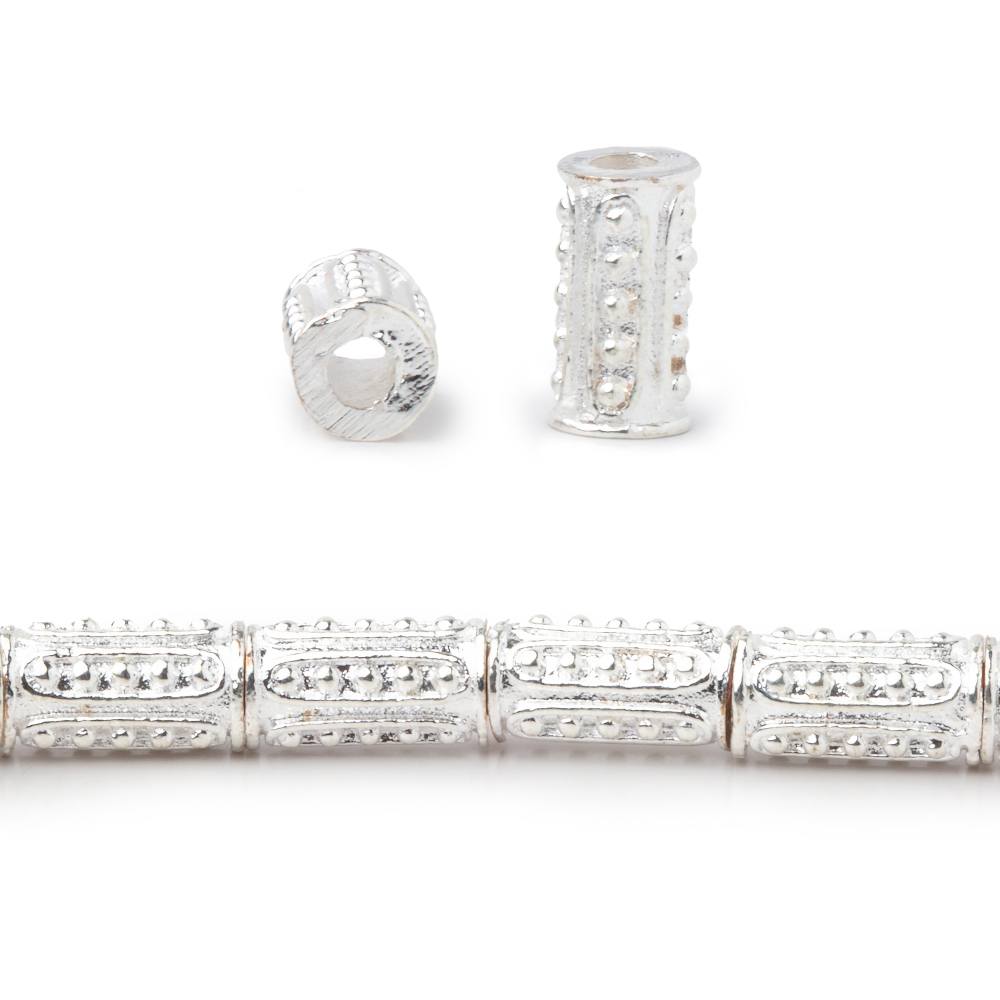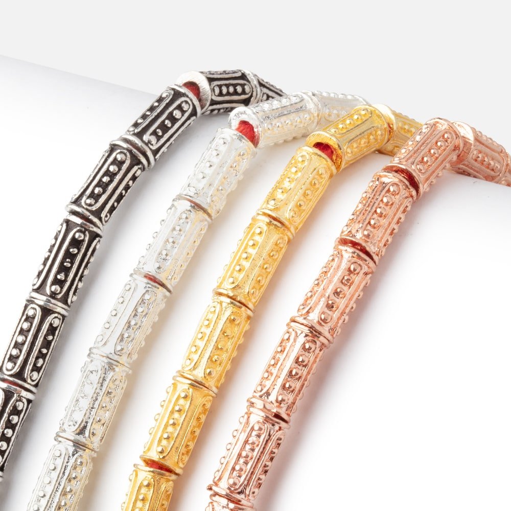 10x5mm Tube Beads with a Dotted Oval Design have a 2.5mm drill hole and are plated over copper. This 8 inch strand with approximately 21 beads is available in Silver, Antiqued Silver, 22kt Gold, and Rose Gold.