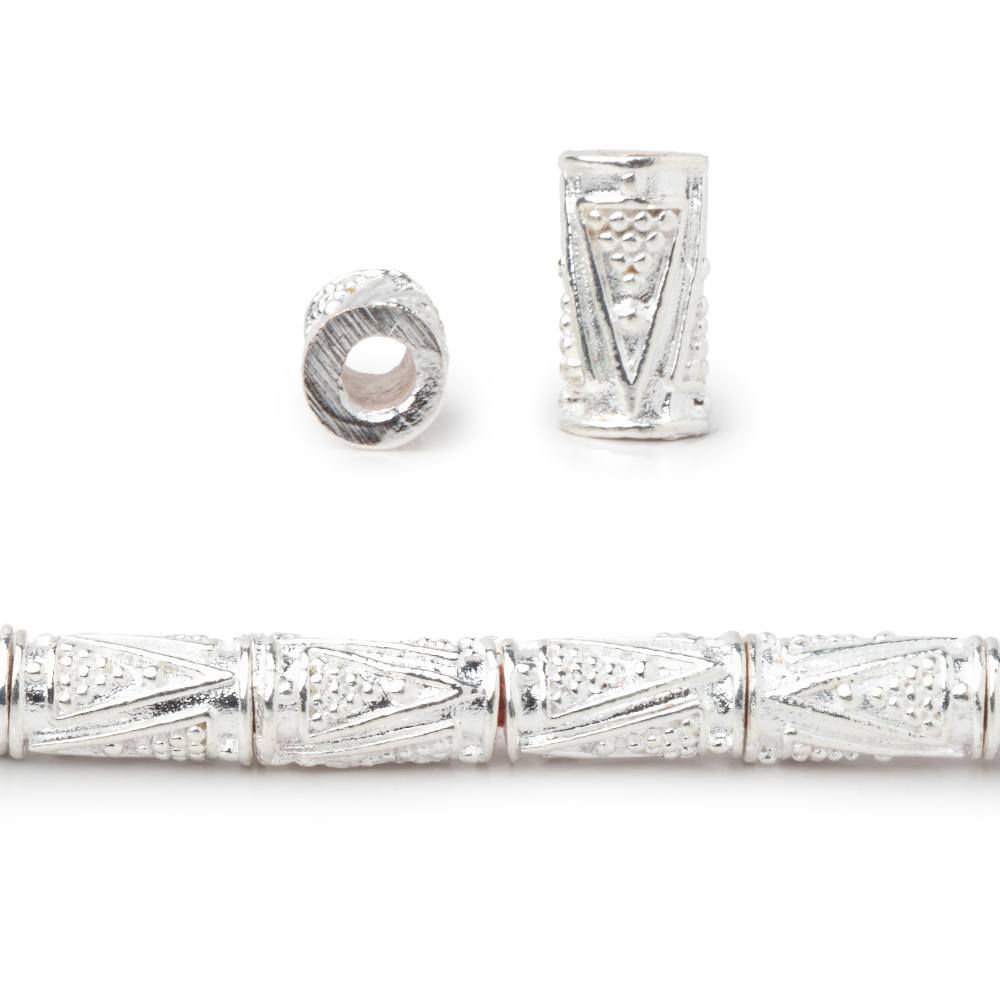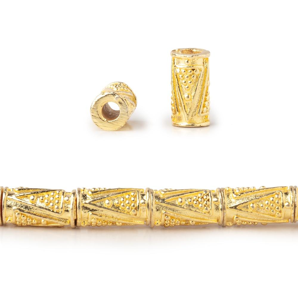 10x5mm Tube Beads with a Miligrain Triangle Design have a 2.5mm drill hole and are plated over copper. This 8 inch strand with approximately 21 beads is available in Silver, Antiqued Silver, 22kt Gold, and Rose Gold.