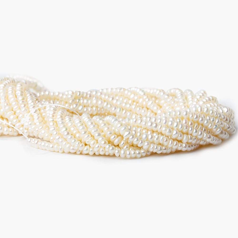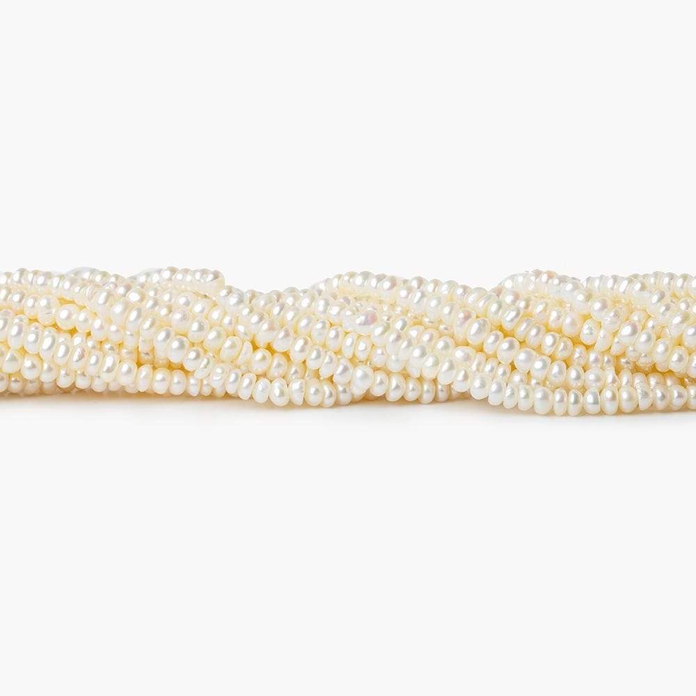 Off White Center Drilled Button freshwater pearls have a soft luster on the natural color Off White or Cream body. These freshwater pearls have a button shape measuring approximately 2.5mm to 3mm average diameter for a petite pearl. The pearls are well matched on the strand for size, color, quality, and shape.