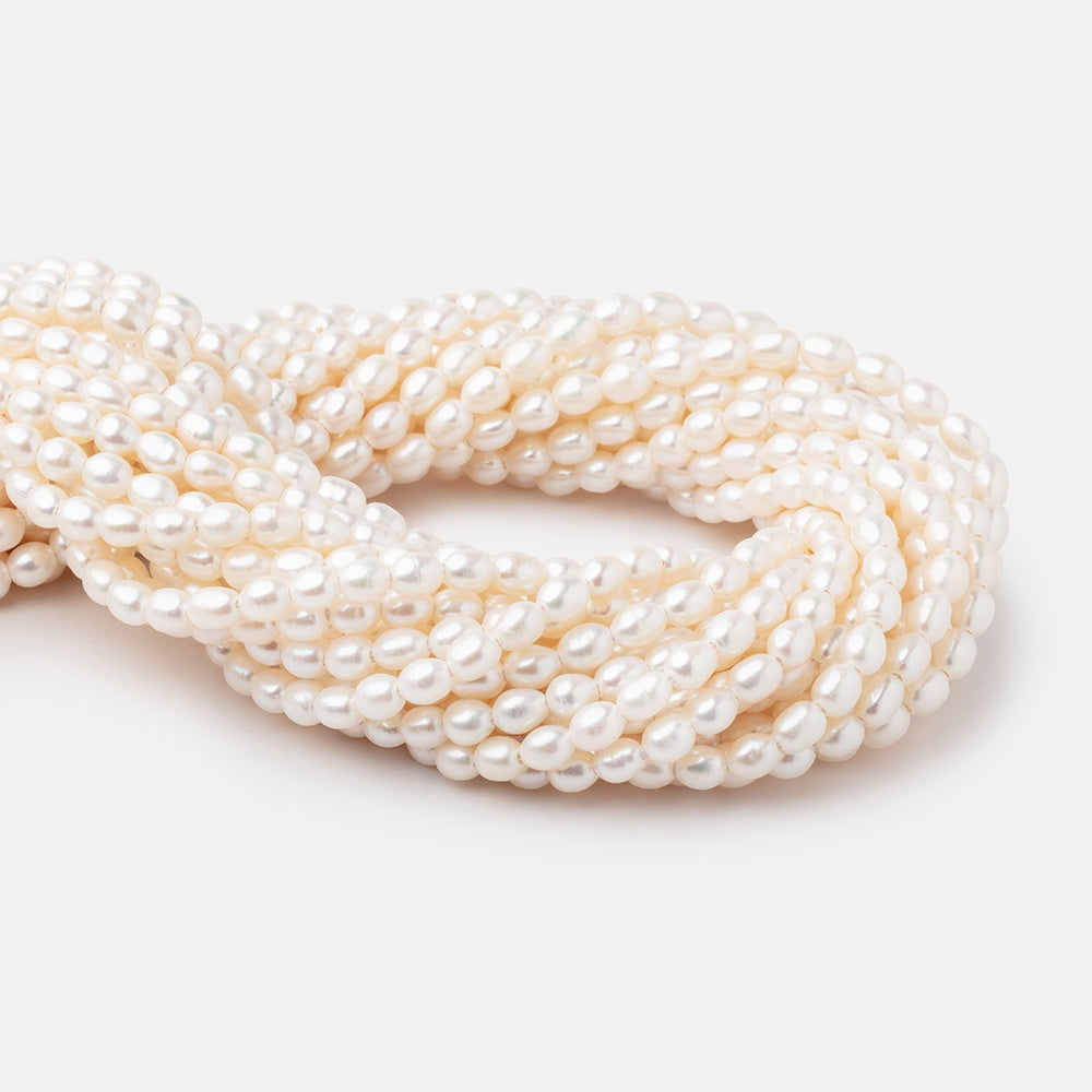 6x4.5mm average Off White Oval Straight Drilled Freshwater Pearls exhibit great nacre on the near metallic luster oval shapes that are symmetrical and show consistent hue on the strand presenting with a 1.5mm large hole size.