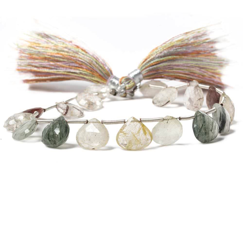 Sagenitic Quartz Faceted Hearts measure approximately 10x10mm on average, have a vitreous luster in a transparent body of exceptional brilliance, the excellent cut and polish on the gems provides a base of crystal quartz with various rutile inclusions such as copper, black tourmaline, green tourmaline, and golden rutile, and the approximate stone count per strand is 17 gems.