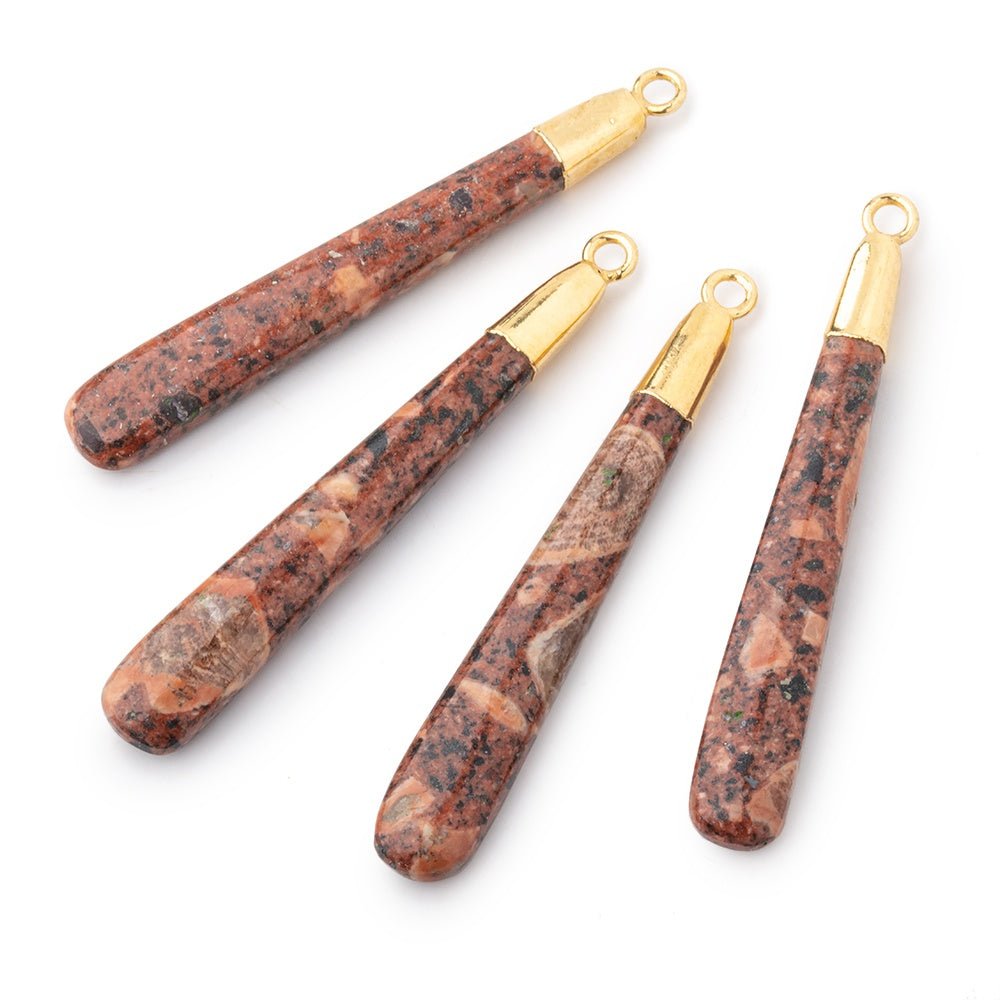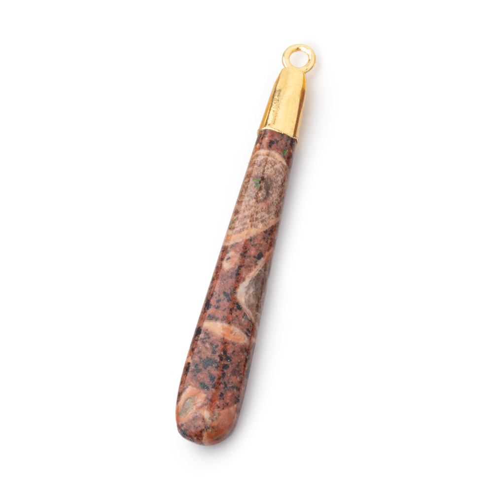 Gold Leafed Jasper plain elongated pear pendants are sold as 1 focal bead measuring approximately 26x6mm to 39x6mm in size with a 3.5mm ring. Symmetrical, opaque beads with glass like luster and great make.
