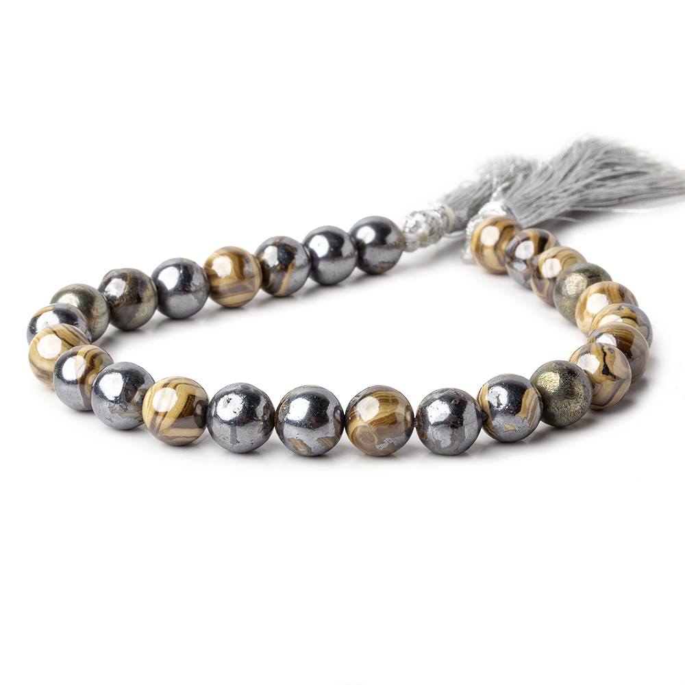 Schalenblende plain round beads present as an opaque banded formation polished to reveal concentric Sphalerite and Wurtzite with metallic areas of Galena. Schalenblende consists of alternating bands of brown-yellow sphalerite, brunckite and wurtzite, and lustrous galena. Sphalerite and Wurtzite are fluorescent in UV light. These beads are symmetrical and have bountiful areas of metallic grey and banded golden yellow and brown hues. AA Rare gemstone mined in Poland