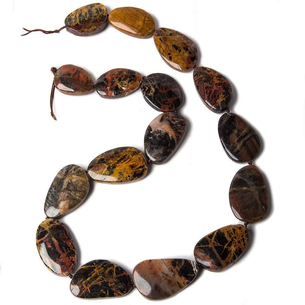 Australian Pilbara Ore Plain Nuggets measure approximately 26x18mm, the gems have a vitreous and dull luster, the gems originate in Australia from Iron Ore Mines, the beads are rich earthy colors of dark brown, black, cream, aubergine, peach, mustard for a landscape effect, and these opaque gemstones have a multi-colored banded ore formation.