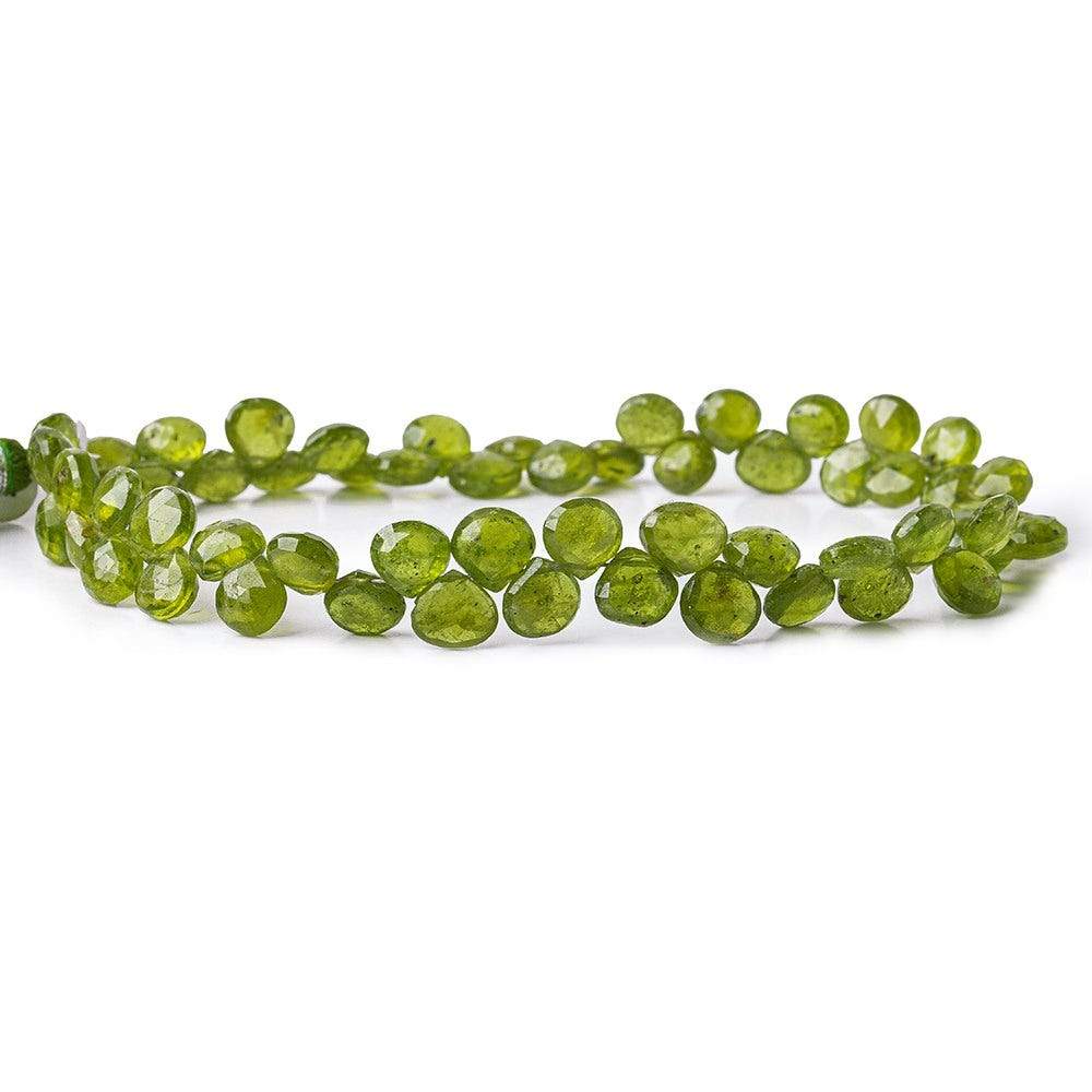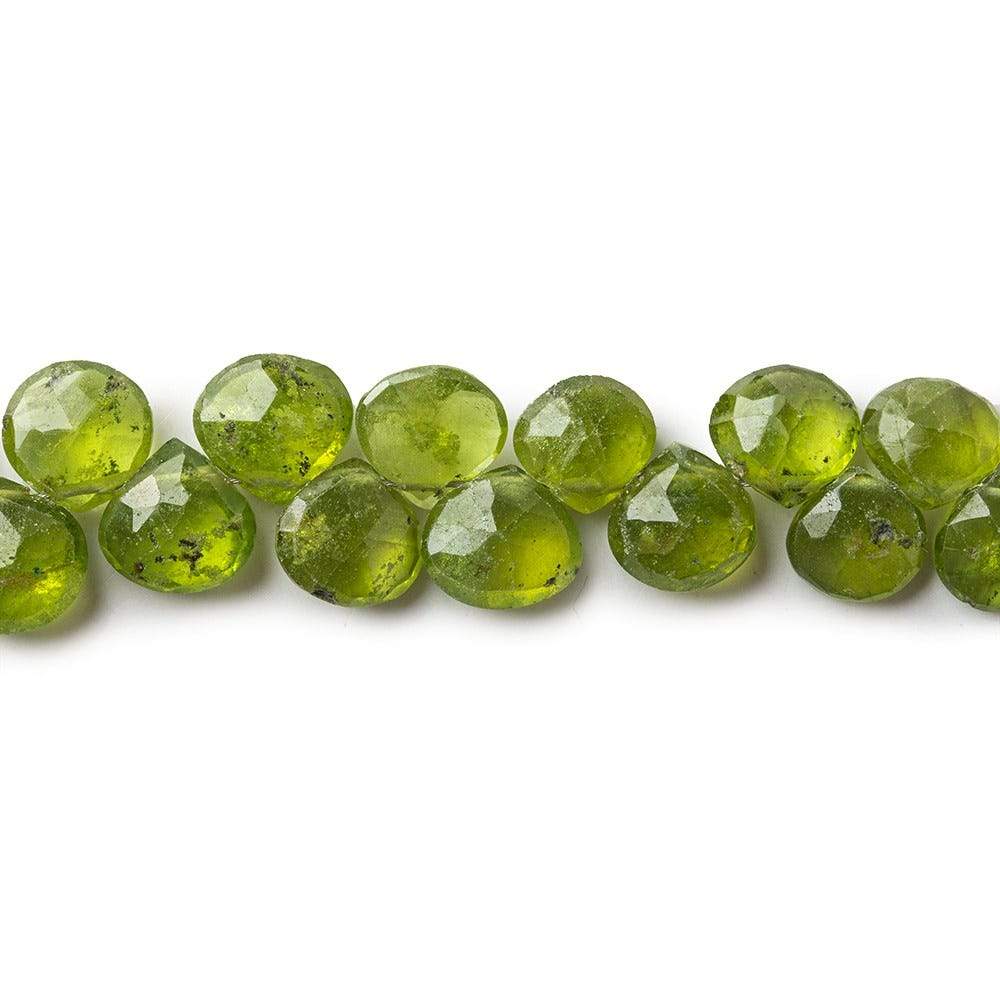 Idocrase Heart Briolettes measure approximately 67x7mm in average size, have a vitreous luster, have a fair polish, have good faceting, are symmetrical in shape, are translucent with moderate internal characteristics, and gems are a medium strongly yellowish green hue.
