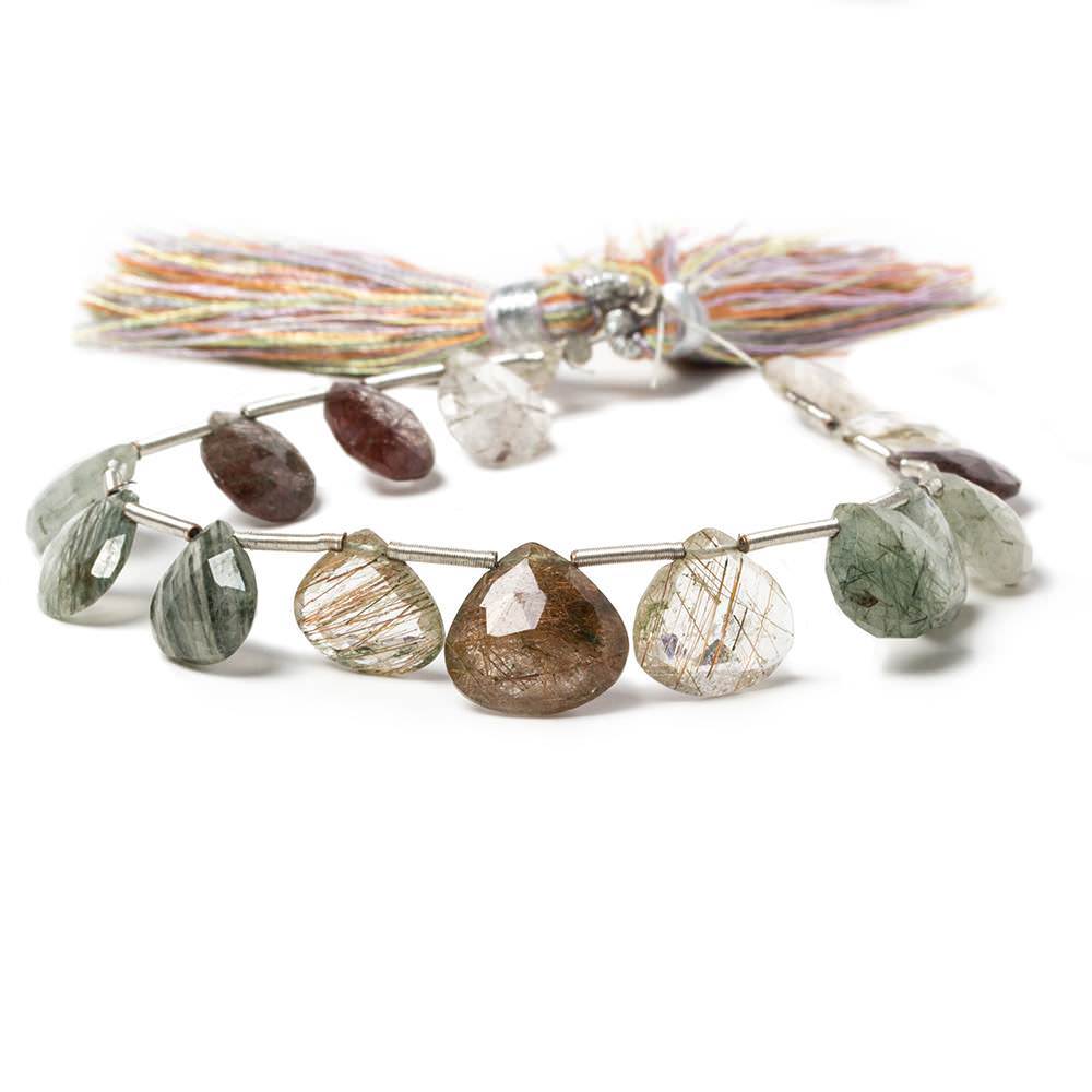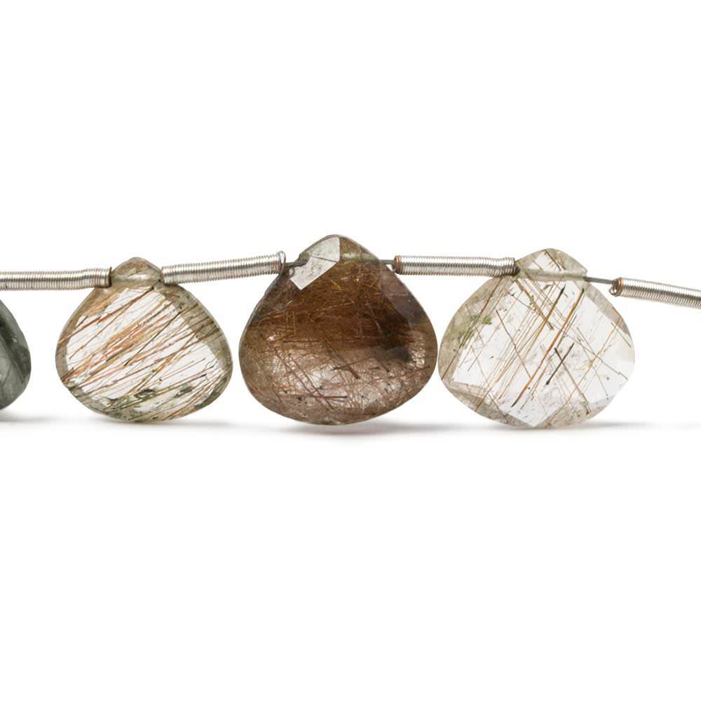 Sagenitic Quartz Heart Briolettes measure approximately 10x9mm to 11x12mm in size, have a glass like luster in a transparent body, the polish is good with slight surface pitting on some gems where the rutile needle meets the surface of the stone, the cut provides a brilliant base of crystal quartz with various inclusions such as copper rutile, black tourmaline, green tourmaline, and golden rutile, the group has numerous varying widths of needle and rutile throughout, and this strand of Rutiled & Tourmalinated Quartz is your chance to try a Sampler Strand!