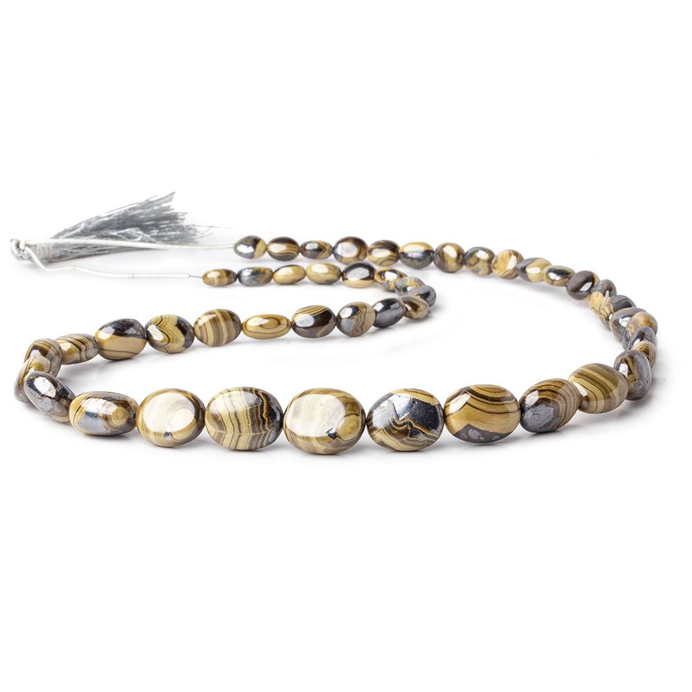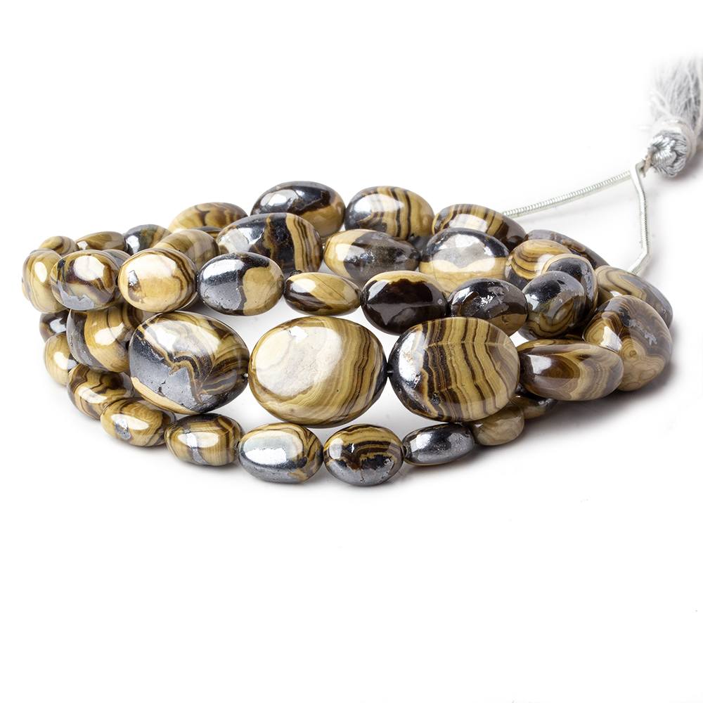 Schalenblende plain nugget beads present as an opaque banded formation polished to reveal concentric Sphalerite and Wurtzite with metallic areas of Galena. Schalenblende consists of alternating bands of brown-yellow sphalerite, brunckite and wurtzite, and lustrous galena of which Sphalerite and Wurtzite are fluorescent in UV light. These beads are asymmetrical and have bountiful areas of metallic grey and banded golden yellow and brown hues. AA Rare gemstone mined in Poland