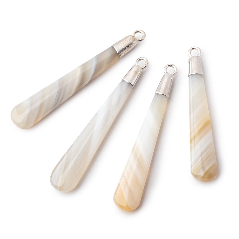 Silver Leafed Champagne Banded Agate pear pendant sold as 1 focal bead measuring approximately 38x6mm average size and 41x6mm with the ring. These symmetrical and translucent beads have a glass like luster and great make.